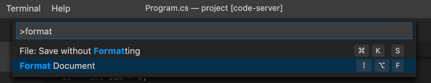 [Command / Ctrl] + [Shift] + [P]に続いて、「Format Document」を選択しましょう。コードが正しければ、変化はほとんどないはずです。自分が書いたコードと見比べて、どのように直すべきなのか考えましょう。
