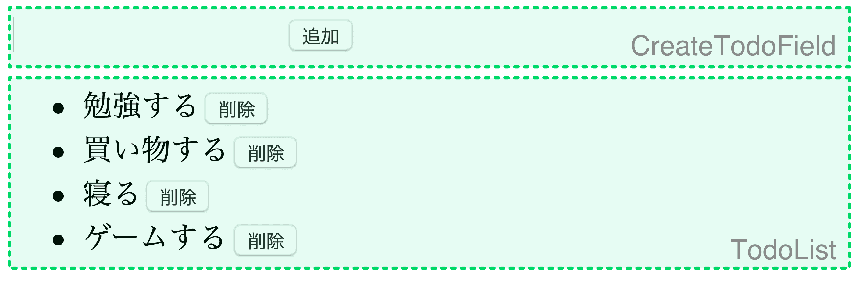 • アプリケーションがどのような状態を持つのかを考えてみましょう。今回の場合は、現在の ToDo のリストと CreateTodoField のテキストボックス内の文字列の2つです。前者はアプリケーション全体に関わる状態なので、App コンポーネントに持たせましょう。逆に、後者は CreateTodoField 内の状態とするのが良いでしょう。